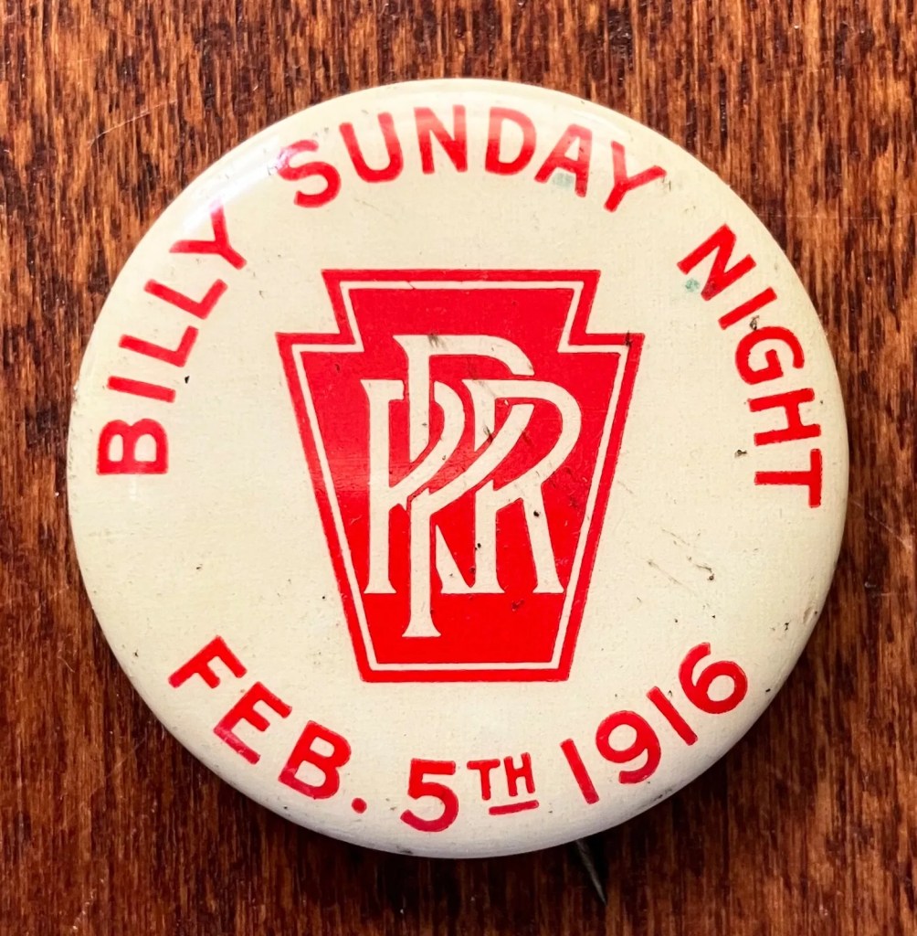 Pinback Button: Billy Sunday Night. February 5th, 1916. Pennsylvania Railroad.