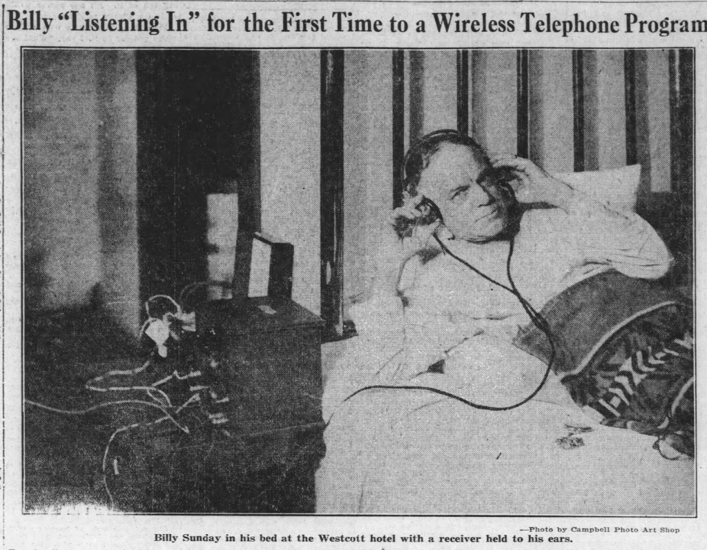 In 1922, Billy Sunday stepped into a new technological frontier by preaching over the “wireless”—what we now call radio. At the time, this was cutting-edge communication. The term “wireless” referred to the transmission of audio over electromagnetic waves, without the use of physical wires or cables. In just a few years, this technology had moved from military and maritime use into the public sphere, and by 1922, commercial radio broadcasting was beginning to take off across the United States.