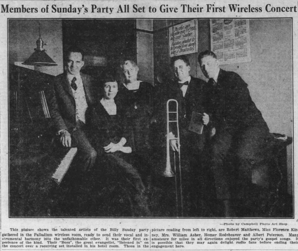 This picture shows the talented artists of the Billy Sunday party gathered in the Palladium wireless room, ready to send their vocal and instrumental harmony into the unfathomable ether. It was their first experience of the kind. ‘Their ‘Boss’, the great evangelist, ‘listened in’ on the concert over a receiving set installed in his hotel room. Those in the picture reading from left to right, are Robert Matthews, Miss Florence Kinney, Mrs. William Asher, Homer Rodeheaver and Albert Peterson. Many amateurs for miles in all directions enjoyed the party’s gospel songs. It is possible that they may again delight radio fans before ending their engagement here.