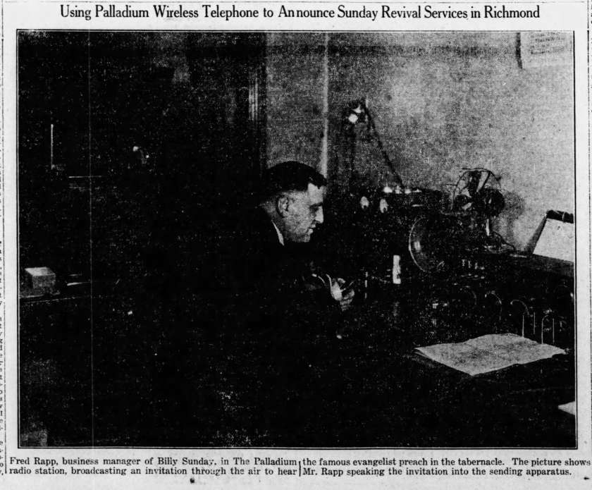 At Mr. Sunday’s request also, the set was left in place all day Thursday to allow him to hear the noon and evening programs of The Palladium. Arrangements will be made to furnish him a set for the entire time he is in Richmond. With a set installed, the former baseball player expects to follow the fortunes of the different teams as they are shown in the daily broadcasts of baseball scores and to get other sport news ‘hot off the bat.’