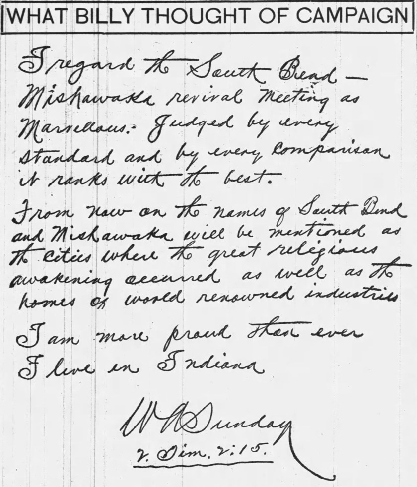 I regard the South Bend – Mishawaka revival Meeting as Marvelous. Judged by every standard and by every comparison it ranks with the best.