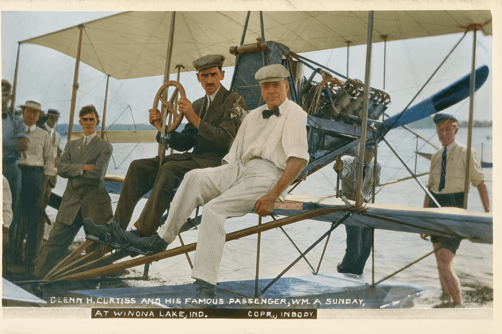 Warsaw, Ind., July 14.-“Billy” Sunday and Glen H. Curtiss, two of the world’s greatest sky pflots, few tagether in the Curtiss hydro-aero. plane on Winona lake today. The evangelist, who is spending, a few days at his Winona home, accepted the aviator’s invitation at the last moment. ” He didn’t flinch as the big air craft sped over the lake a distance of at least two miles. More than 15,000 people saw the three successful flights that were – made by Curtiss.