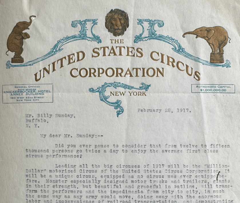The letter opened by reminding Sunday of the enormous audiences that circuses attracted: